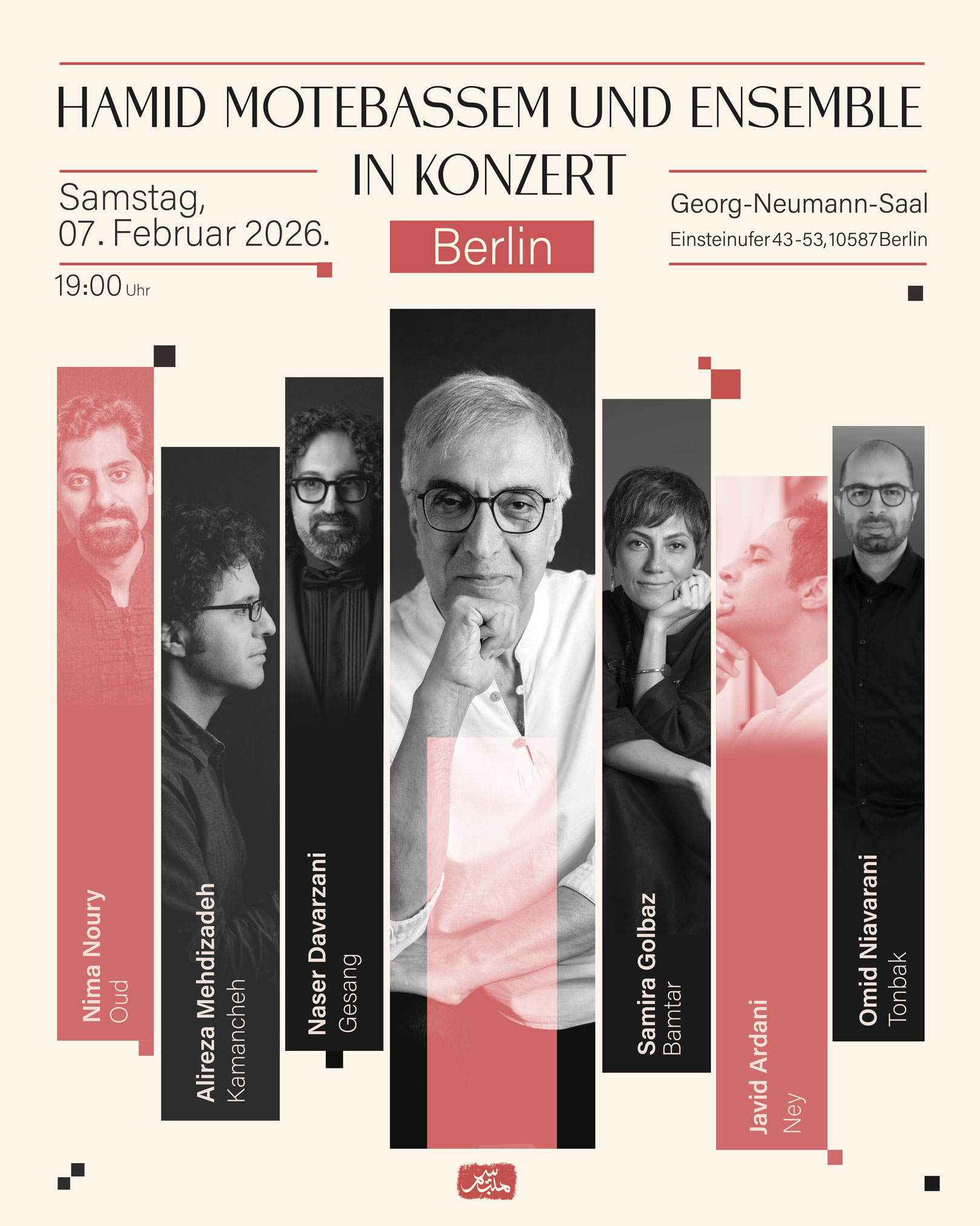Nach 40-jähriger Musikerfahrung und über 1.600 Auftritten in der ganzen Welt, betritt der bekannte Instrumentalist und Komponist Hamid Motebassem am 07. Februar 2026 mit einem Sänger und fünf jungen Musikern auf der Bühne des Berliner ‚Georg-Neumann-Saals'.